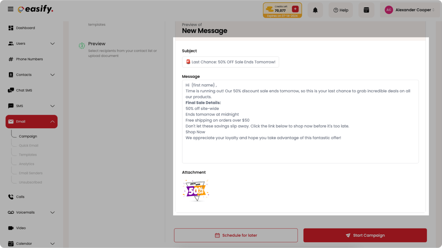 6. Click Start Campaign to send it now or schedule your Email for a later time if you don’t want it to send it immediately. Click on Schedule for later, choose the date and time, and confirm.