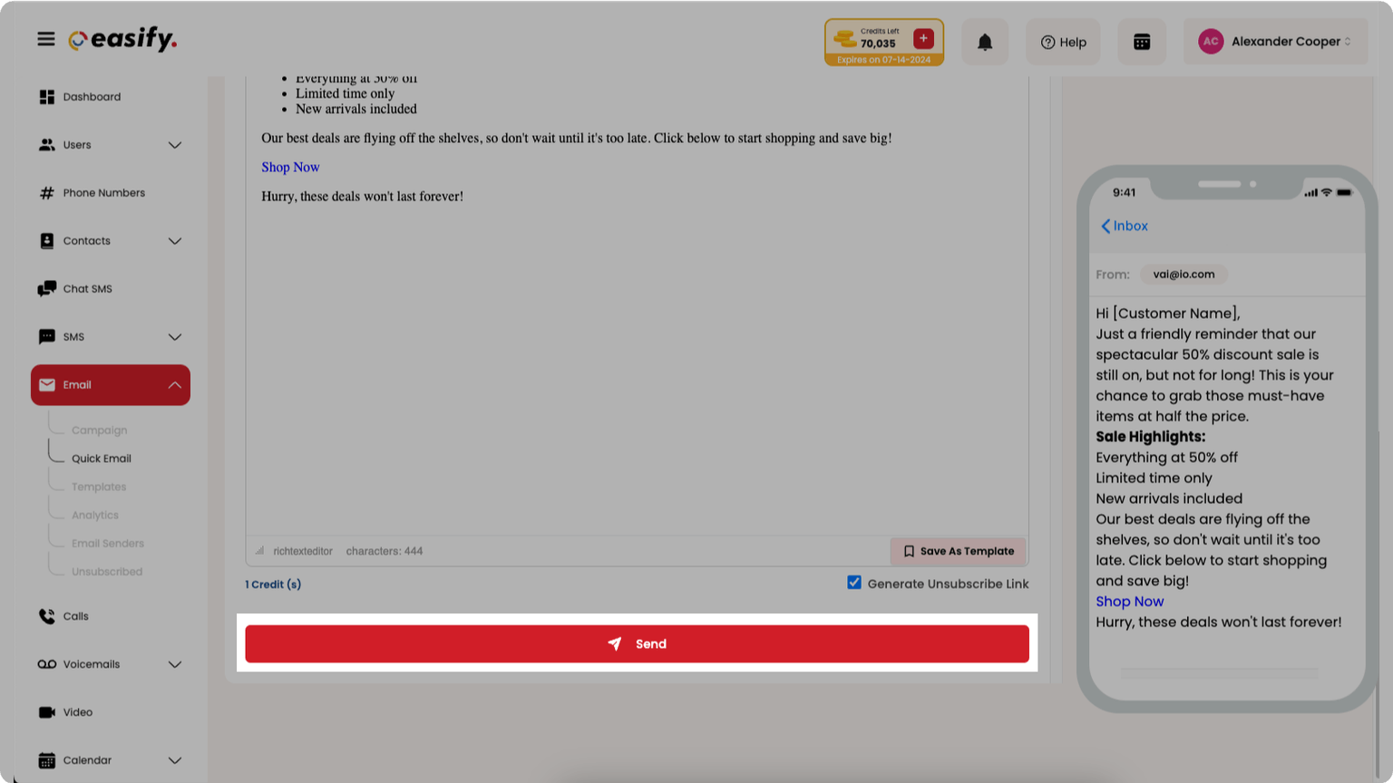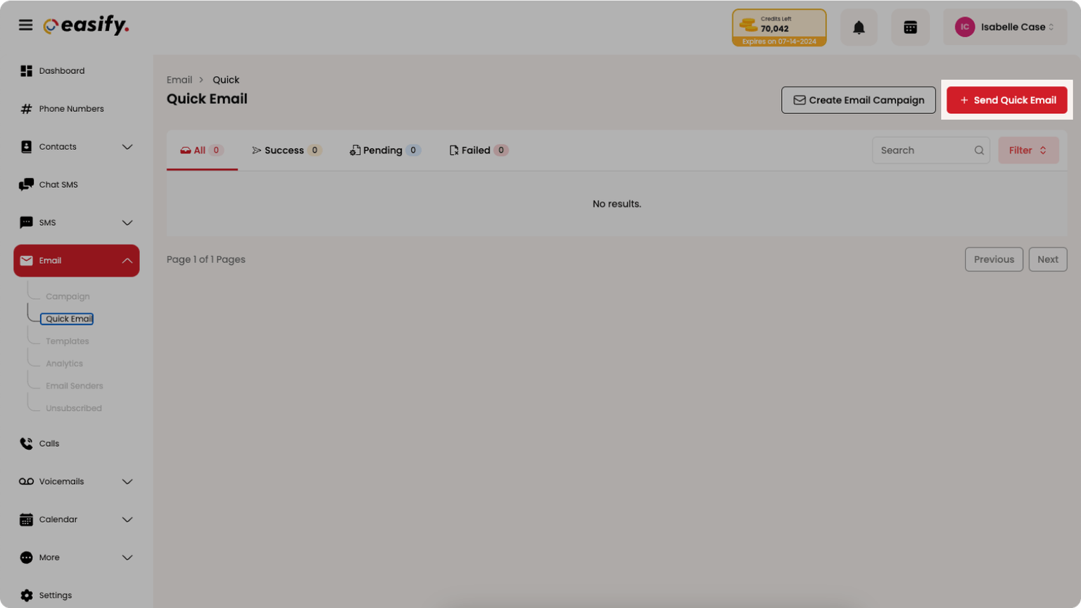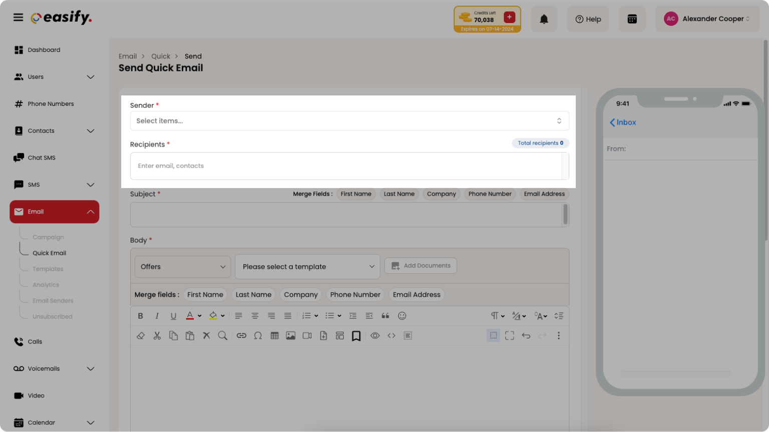 The Quick Email feature is used when you need to quickly deliver your email. You can send a quick email to a maximum of 10 recipients at a time. Here is how you can send a quick email with Easify.