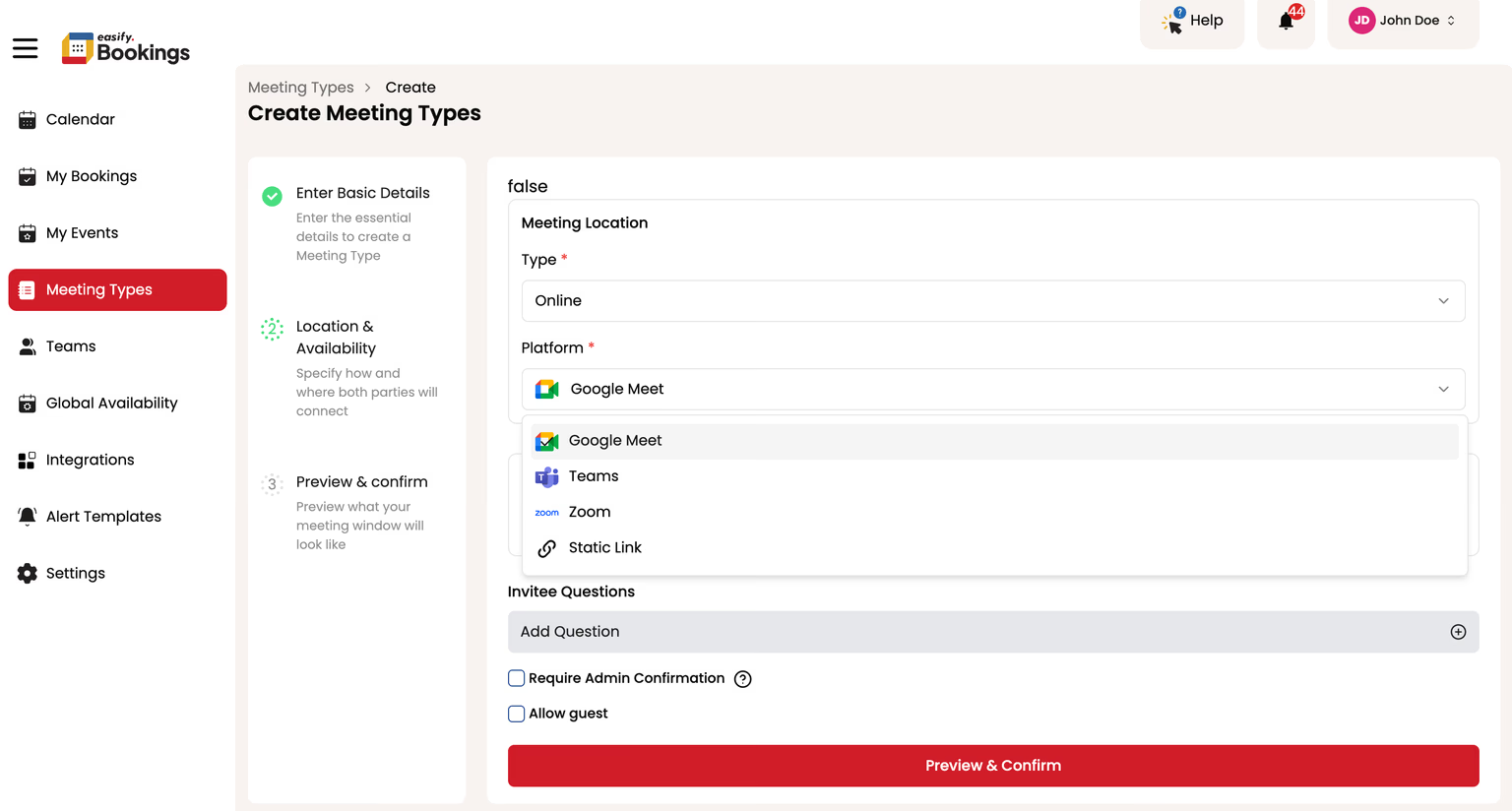When Creating a new Meeting Type, Choose that Platform as “Zoom”. This option will only be available if the user has Zoom Connected.