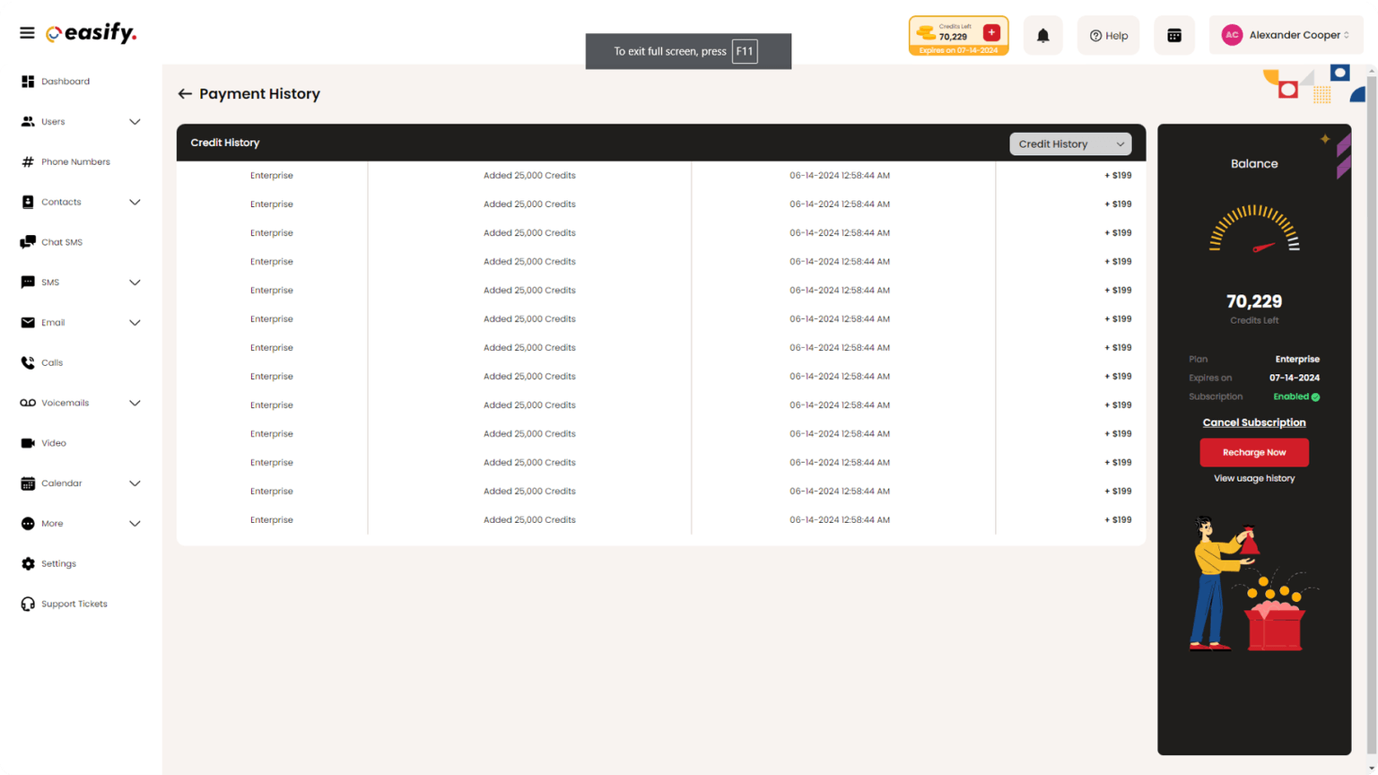 As the name suggests, the plan is a perfect choice for large enterprises. The plan offers 25000 credits and 2 phone numbers for $199/month.