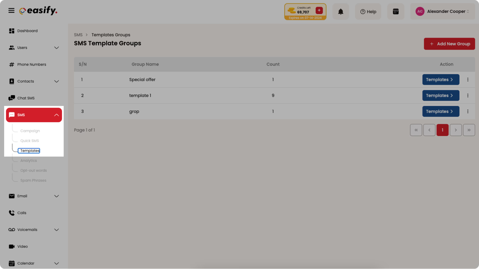 3. The group list appears on the screen. Click Templates, then click Create Template.